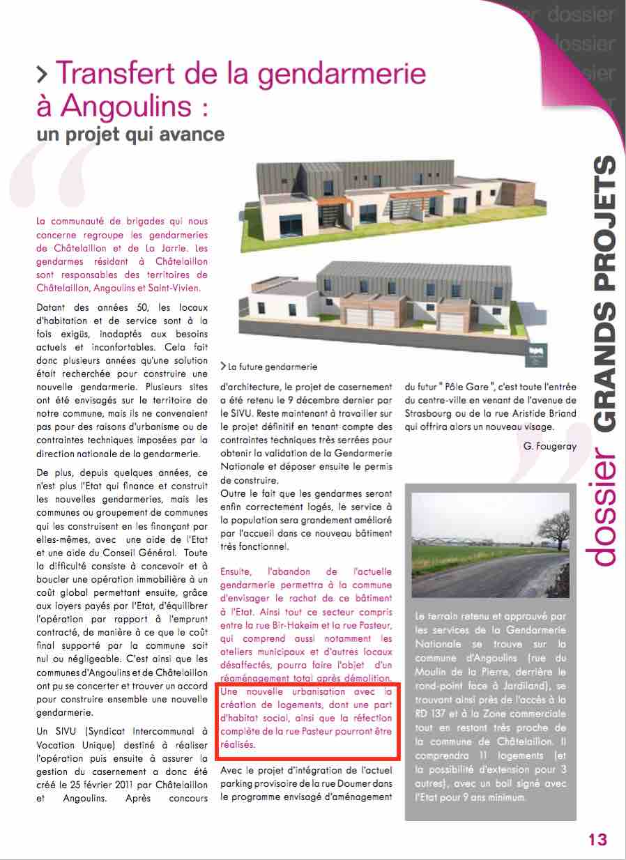 L’un des signataires de notre pétition nous a signalé que le magazine mensuel officiel de la commune Châtel-Mag n° 61 d’avril 2012 précisait en page 13 à propos du secteur de l’ancienne gendarmerie: