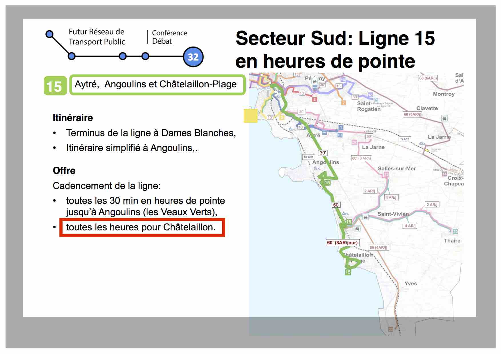 Pourquoi une telle discrimination à l’égard de notre commune alors que la ligne 16 actuelle est parmi les 10 lignes les plus fréquentées de l’agglomération rochelaise ? Pourquoi ne pas, au contraire, améliorer cette ligne vers La Rochelle en en faisant une ligne plus rapide
