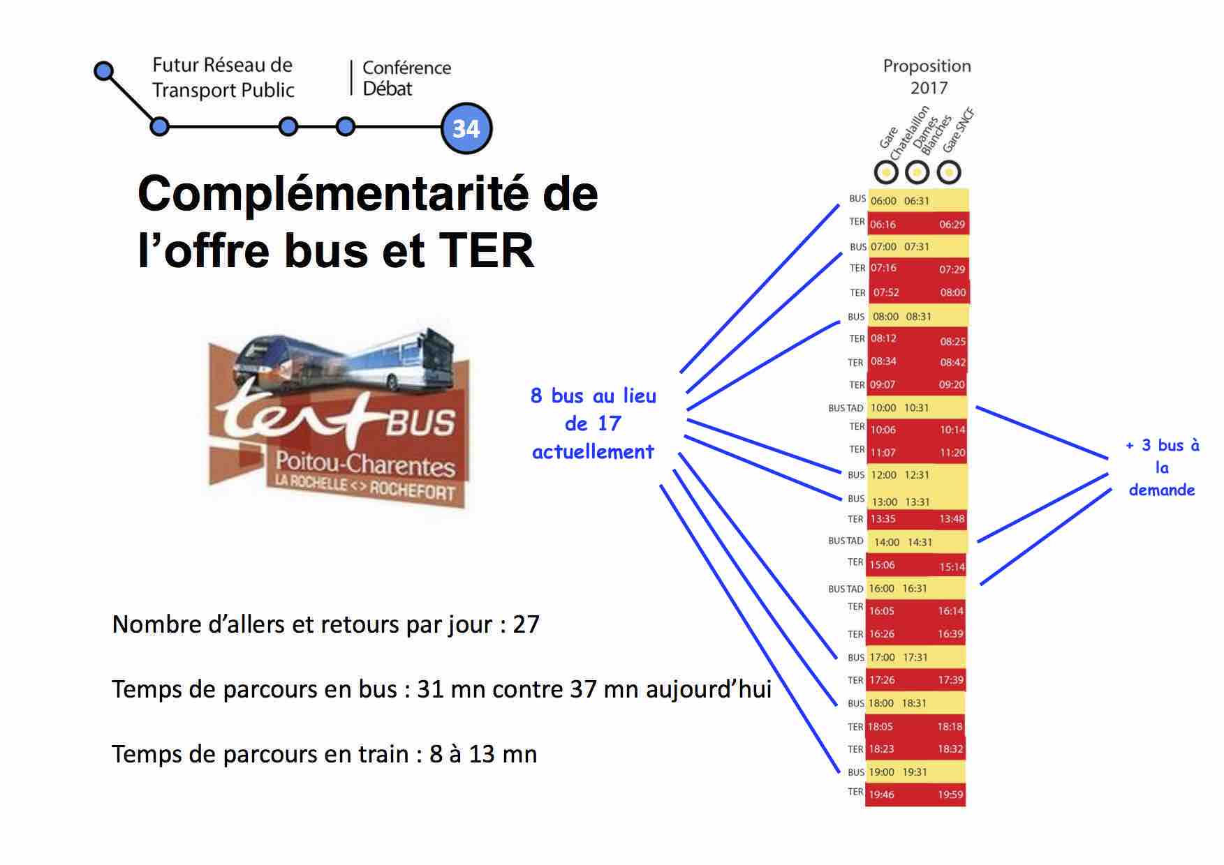 C’est ce que prévoirait pour les trajets entre Châtelaillon et La Rochelle le projet de nouveau réseau de transport de la Communauté d’Agglomération (CdA) à partir de juillet 2017. Pour la CdA, à la place des bus supprimés, les Châtelaillonnais devraient prendre le train, jugé plus rapide. Cela est bien sûr incontestable. Mais ce raisonnement néglige totalement les trajets terminaux centre ville-gare et gare-centre ville. Avec, de plus, leur rupture de charge inévitable, ces derniers rendent le trajet via le TER moins
