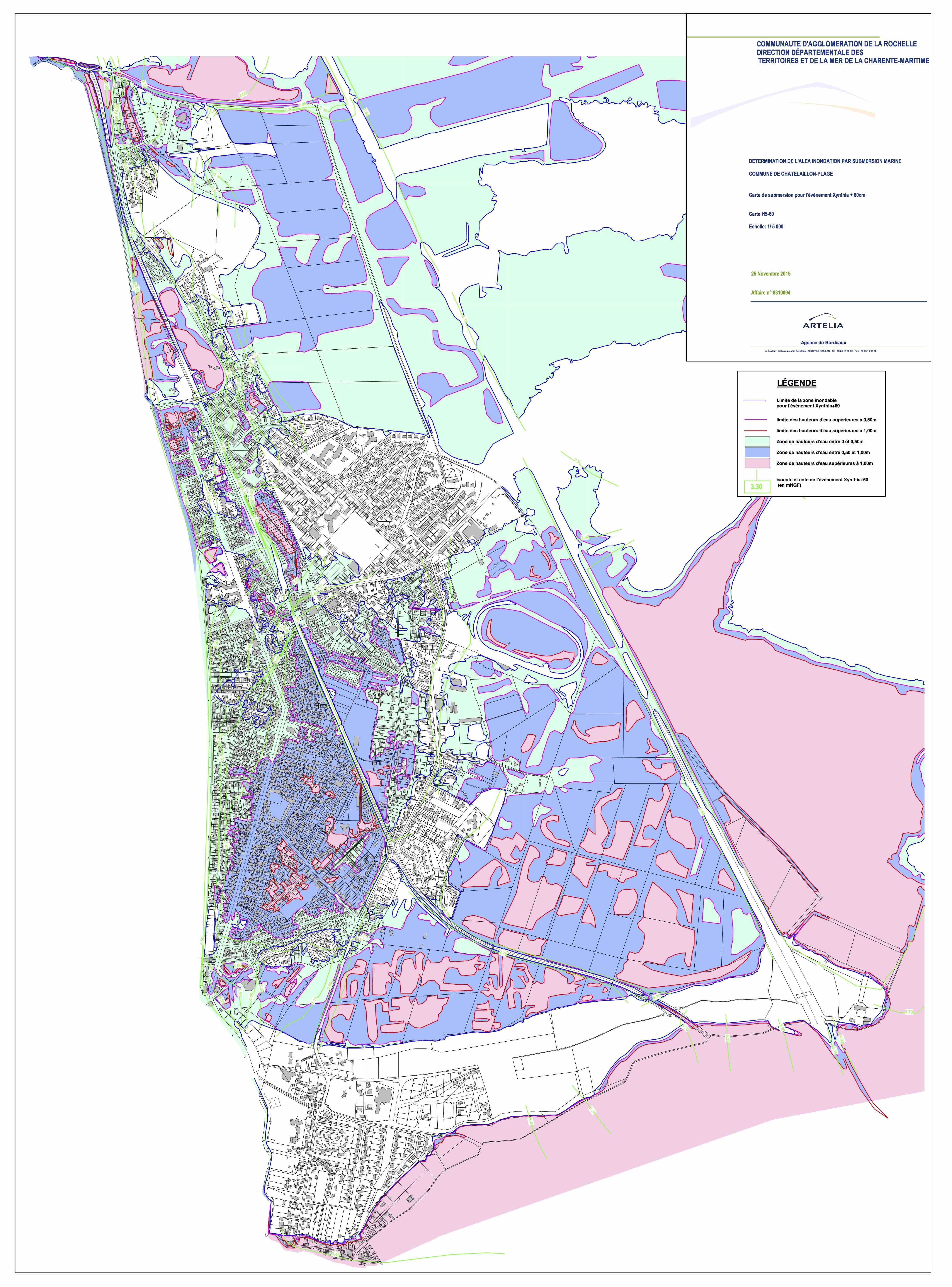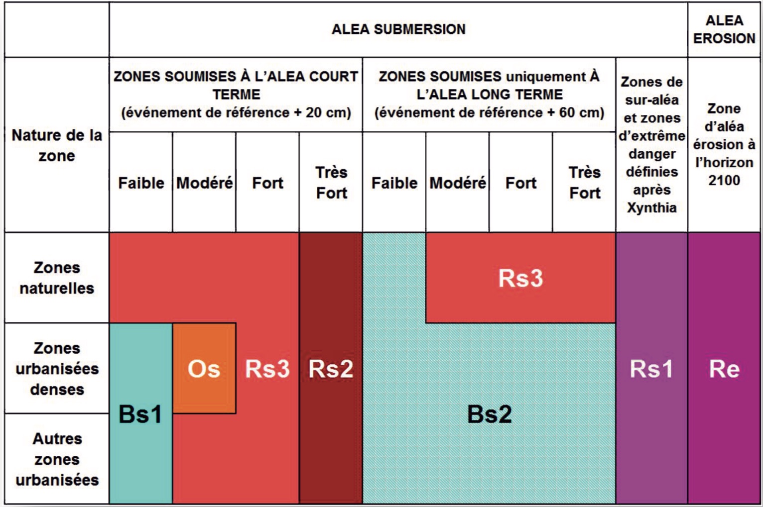 - La carte de zonage résulte d’une méthodologie très élaborée basée sur une étude de submersion menée par la CdA de La Rochelle. Elle croise la nature de la zone concernée (urbanisée, fortement urbanisée, naturelle, ostréicole etc…) et le niveau d’aléa (faible, modéré, fort, très fort) . Ce dernier résulte lui-même du croisement entre hauteurs et vitesses de l’eau en cas de submersion pour les deux scénarios étudiés : à court terme (Xynthia + 20cm) et à long terme (Xynthia + 60cm). Le tableau consultable ici explicite ce croisement. (Les zones restantes en blanc sur la carte de zonage ne sont pas concernées par les prescriptions du PPRL).