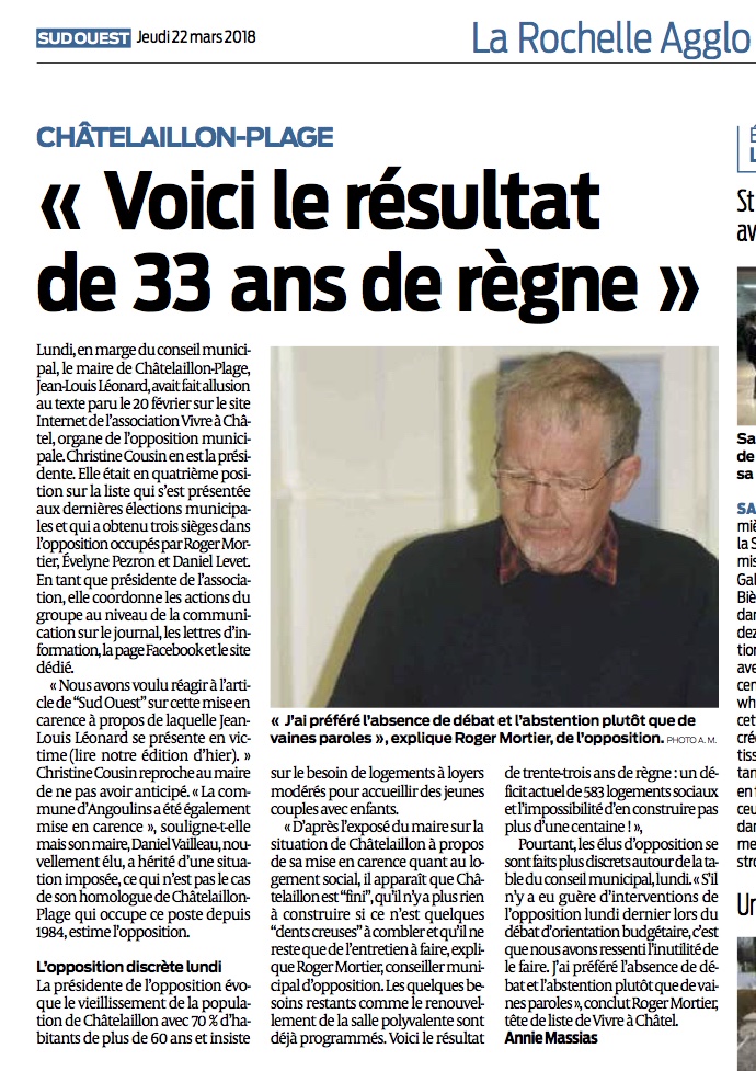 Le lendemain, Sud Ouest, dans son édition du 22 mars, rapporte, sur le même sujet, les propos de notre présidente, Christine Cousin et de notre premier élu, Roger Mortier sous le titre de l’article « Voici le résultat de 33 ans de règne », consultable ici. Nos lecteurs apprécieront, en quelque sorte, un droit de réponse fort opportun.